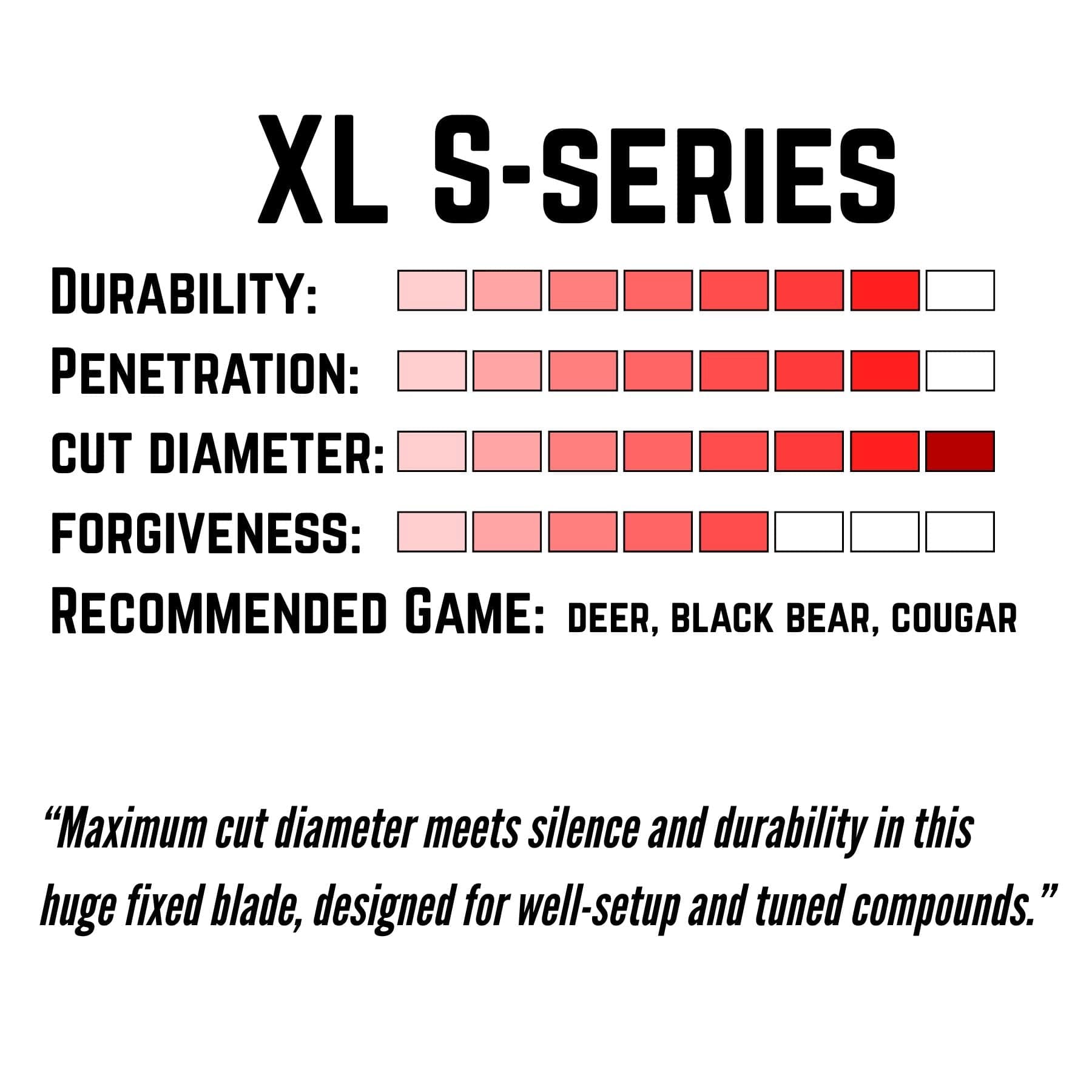 Recommended for: advanced compound shooters with excellent form, seeking a large cut, silent fixed-blade broadhead for deer and bear sized game.
