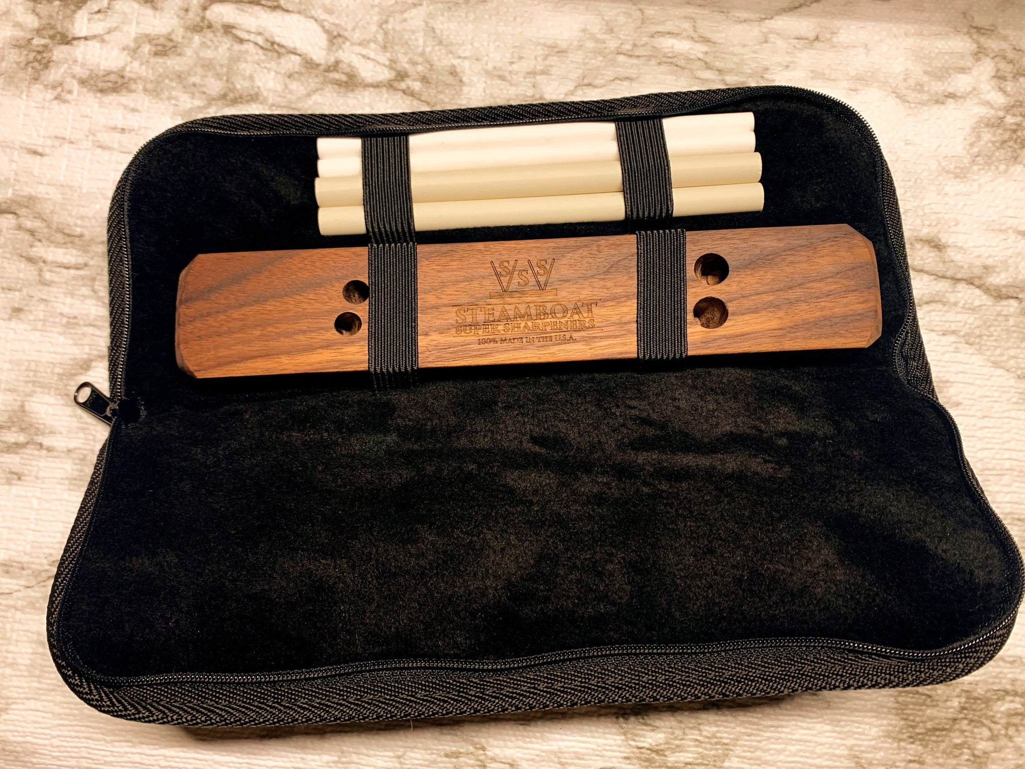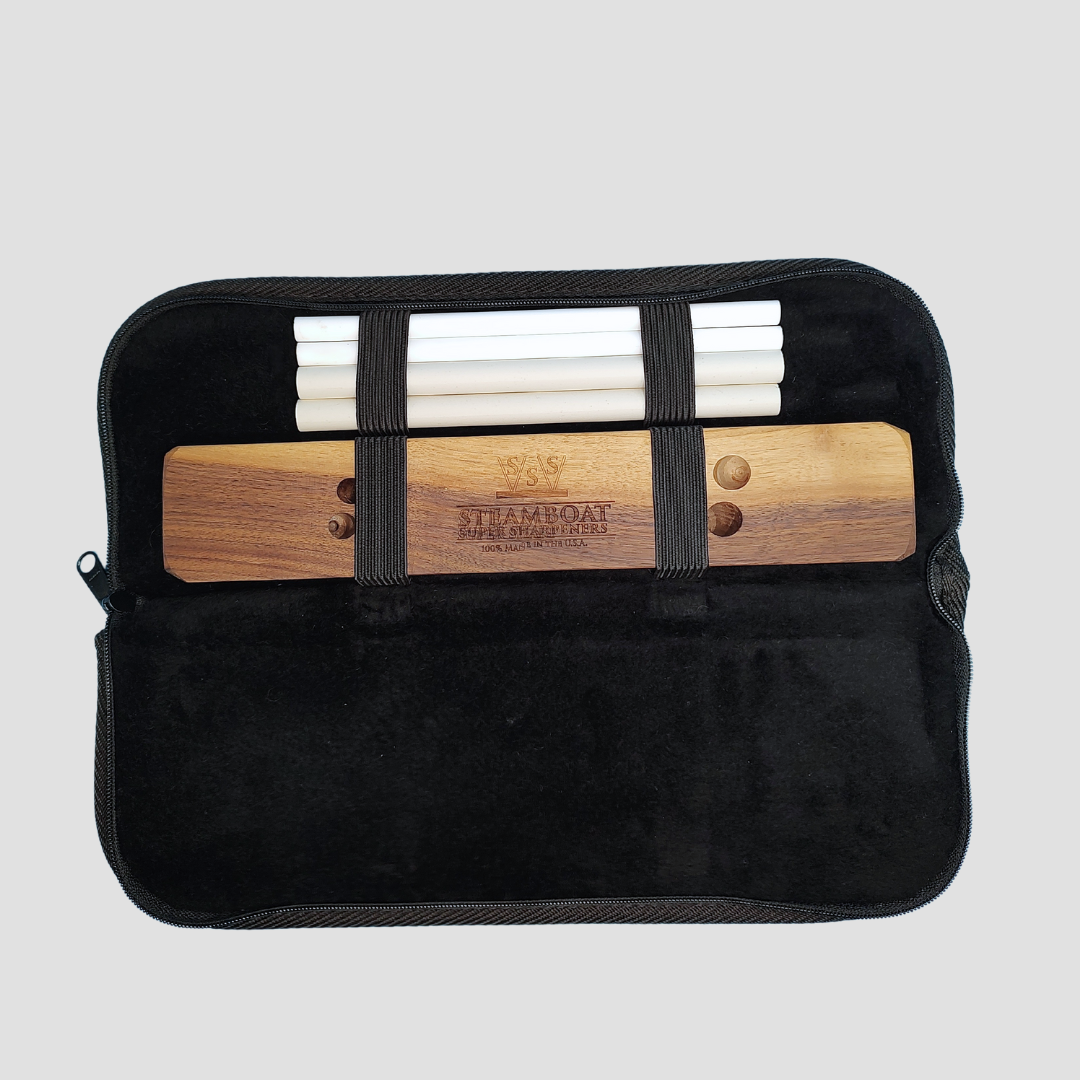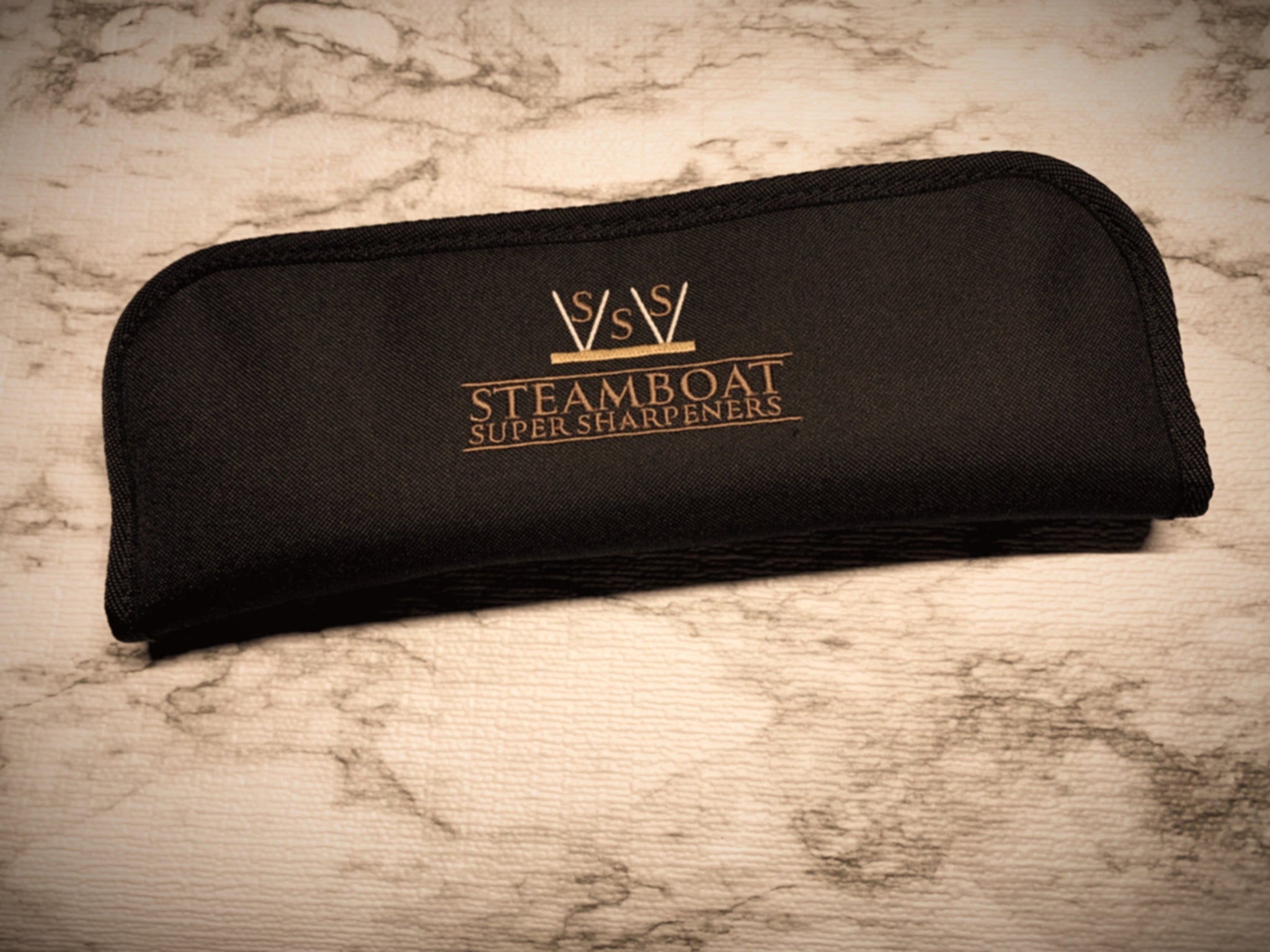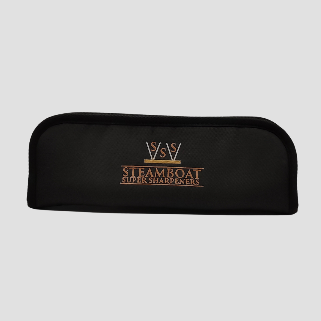 Using this premium protective pouch is a great way to protect your sharpener when it's not in use. Elastic bands hold both the base and four rods securely to plush padding, keeping the unit safe during storage and travel. It's also embroidered with our logo!