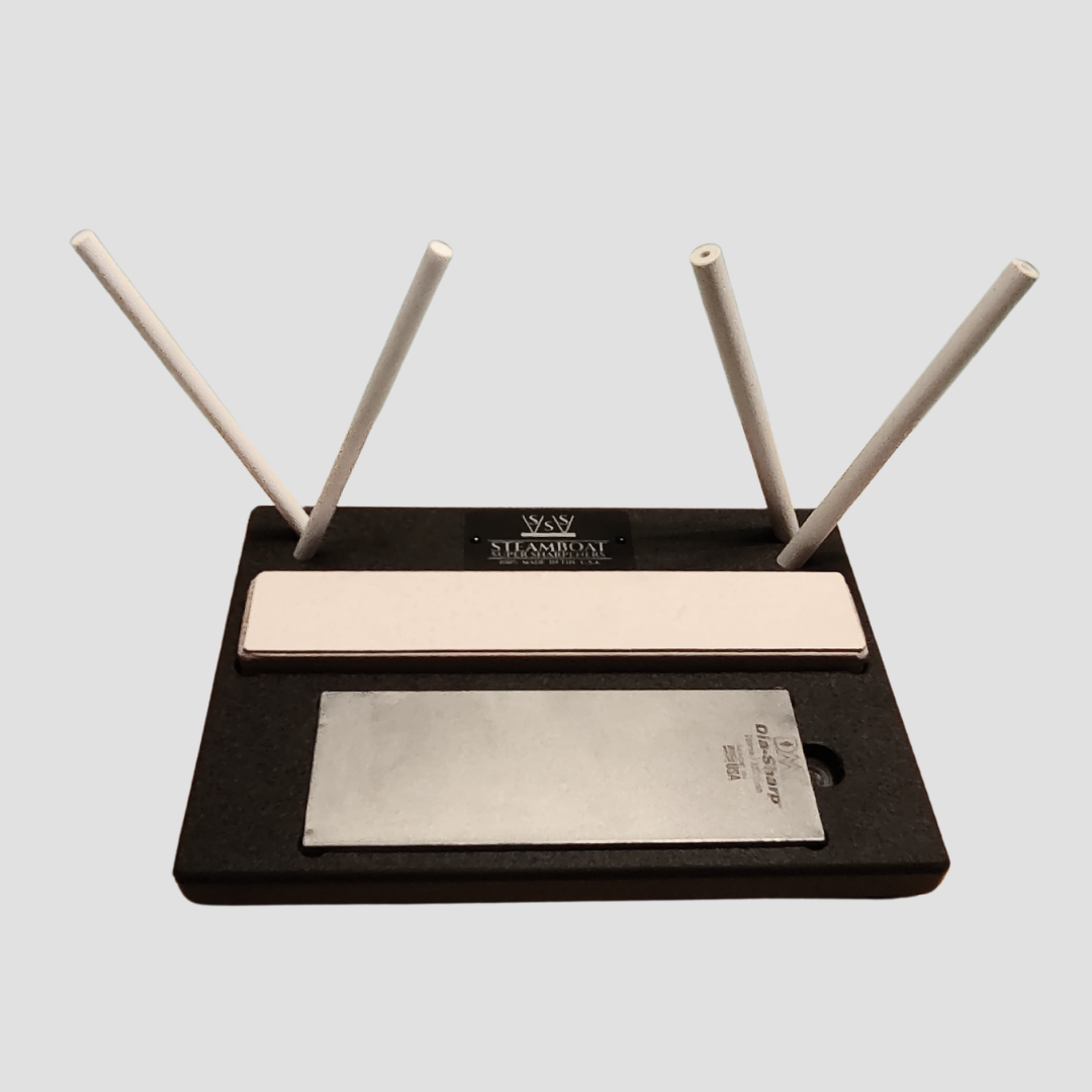 The little brother to the 2 stone station. This includes one American Made DMT double sided Diamond stone in Coarse 325/Fine 600, SSS Strop and our Ultimate Series rods. This has the same benefits as the Station, just in a smaller package and still will cover the majority of anything you got with the combinations of sharpening systems included. American made by SSS.